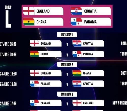 世界杯L组赛程:首战英格兰vs克罗地亚6月18日6时打响