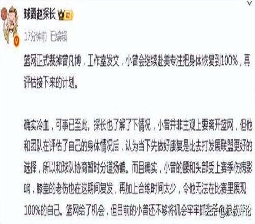 媒体人:曾凡博非主观要离开篮网,评估后认为康复比发展联盟更好
